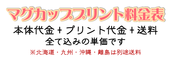 | ーステンレスマグカップ計算方法ー 例/5種類のデザインを片面プリントと標準プリントを各1個ずつ=合計10個の場合 片面プリント@2.750円×5種類+標準プリント@3.080円×5種類=29.150円(税込金額) しかも送料も無料!とてもお得です! |