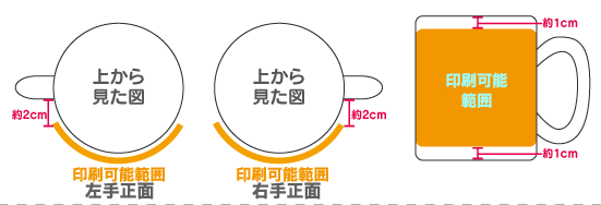 | ご注文に関しまして 必ずしもプリント可能範囲全面にプリントする必要はありません。 この範囲内でご希望のサイズと位置にプリントいたします。 特にご指定がない場合は、当社にてバランスを考えて、 リサイズプリントしますのでご安心ください。 特段のご指示がない場合は、右手持ちを基本としてプリントいたします。 |